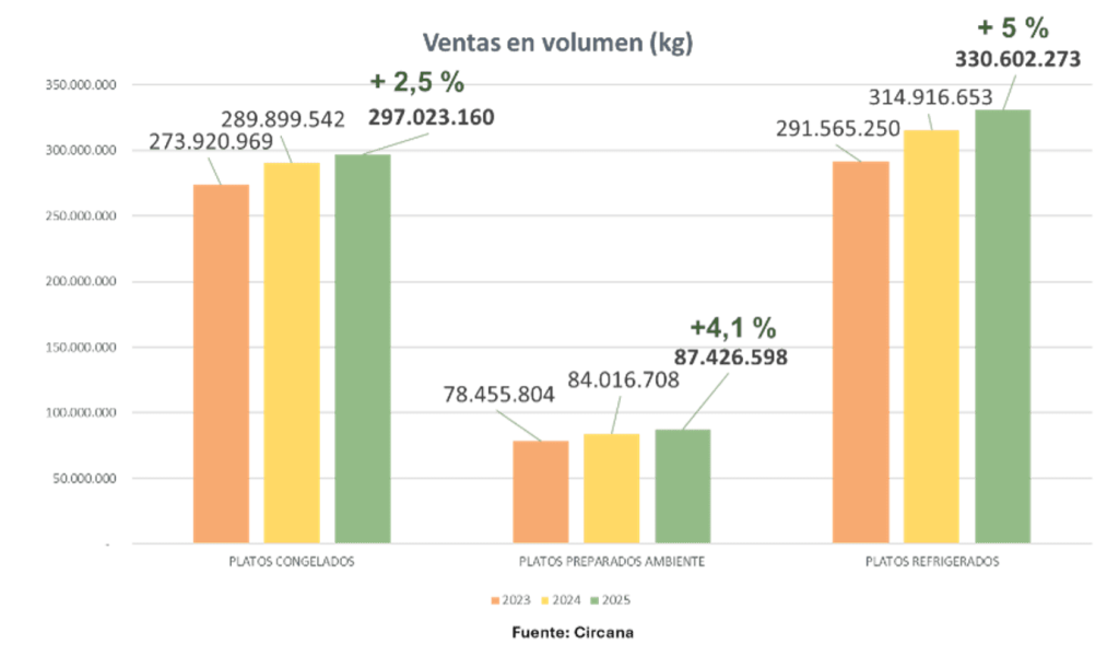 Por tipología de producto, los platos preparados refrigerados mantienen su posición de liderazgo en el mercado, con un volumen total de 330.602 toneladas y un crecimiento interanual del 5%, seguido de los productos congelados 297.023 toneladas con un aumento del 2,5%, y los platos a temperatura ambiente, con 87.426 toneladas y un incremento del 4,1%.